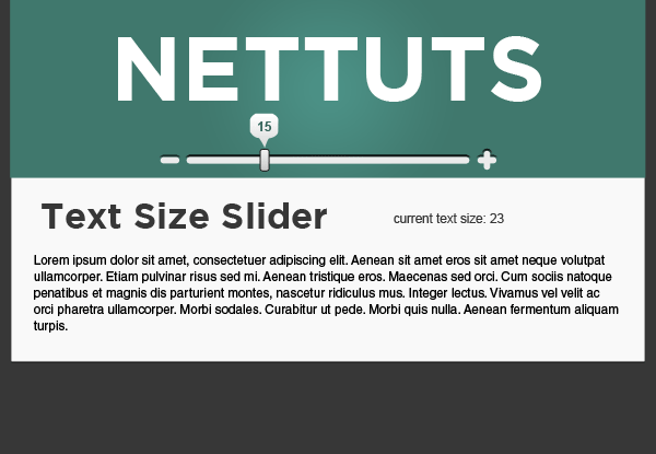 Jquery UI Slider Pips - Simey.me - GitHub Pages This will add the markers along the slider, and place the min/max values to the beginning/end of the slider: ($) // to create the slider on the page we use jQuery to select the element // from the HTML and apply the .slider () method, then we apply the pips afterwards. $(".slider").slider().slider("pips"); Float Slider Widget | jQuery UI API Documentation The slider widget uses the jQuery UI CSS framework to style its look and feel. If slider specific styling is needed, the following CSS class names can be used for overrides or as keys for the classes option: ui-slider: The track of the slider control. This element will additionally have a class name of ui-slider-horizontal or ui-slider-vertical ... JQuery UI Slider Labels Under Slider - iTecNote Initiate the slider. · For each of the possible values, append a label element with position: absolute (the slider is already position: relative , so the labels ... jQuery UI 实例 - 滑块(Slider) | 菜鸟教程 jQuery UI 实例 - 滑块(Slider) 拖动手柄来选择一个数值。 如需了解更多有关 slider 部件的细节,请查看 API 文档 滑块部件(Slider Widget)。 默认功能 基本的滑块是水平的,有一个单一的手柄,可以用鼠标或箭头键进行移动。 jQuery UI 滑块(Slider) - 默认功能 $(function() { $( '#s..